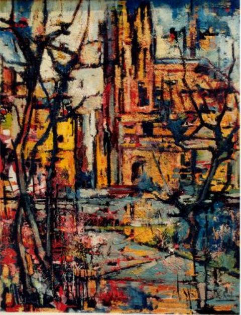 La catedral submergida, 1959 – oli + full d’or sobre fusta 81 x 65